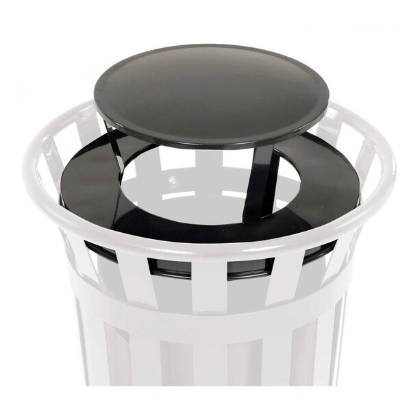 Rain bonnet lid for 24 gallon Global Industrial™ outdoor steel slatted receptacles. Black color finish.