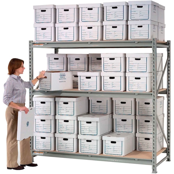 Heavy duty shelving with file boxes makes organized record storage affordable and convenient. High capacity steel racks, with up to 3800 lb. capacity per level, handle the biggest record storage needs. Made using boltless 12-gauge steel horizontal beams with 3-hook connector end plates that allow easy installation without tools. Beams adjust in seconds at 1-1/2in increments. Uprights are 14-gauge steel. Rack is finished in gray powder coating. Rugged 200 test corrugated transfer file boxes protect and organize records for storage with double-thick front and back walls, large label area and hand holes for easy lifting and portability of stored records. Boxes fit securely on rugged 5/8in thick particleboard decks. 36inD Unit stores 2 rows with access from both sides and include 5 additional supports per level to handle any record storage job. Easy assembly.