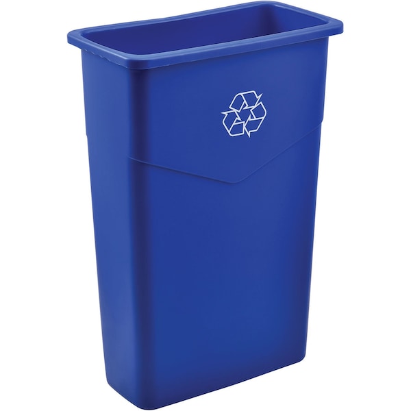 Designed to fit in tight spaces or along workstations. Corner tabs help secure trash bags in place. Garbage cans feature built-in finger grips on top rim and handles on bottom which makes lifting and dumping easier. These receptacles are constructed of heavy duty plastic to resist dents and corrosion. Smooth surface makes for easy cleaning. Includes recycling logo for easy identification. Lid sold separately.