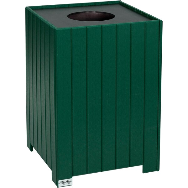 Global Industrial™ Recycled Plastic Receptacles are ideal for use in parks, schools, office grounds and more. Maintenance-free, durable plastic construction resists cracking and splintering, withstands the elements and does not require sanding, sealing or painting. Made with twenty-eight 1in x 4in resinwood slats with natural wood textured finish on four pre-assembled panels. Includes heavy duty zinc coated hardware and molded, flat top lid with 11in diameter disposal opening. Includes 32 gallon liner made of leak-proof seamless plastic for easy cleaning and waste disposal. 32 gallon capacity. Green color finish. Assembly required. Overall dimensions: 24inW x 24inW x 33inH. Includes: 4 Pre-assembled Panels, 1 Lid, 1 Bottom Panel, 8 Triangle Corner Blocks, 1 32 Gallon Liner, 32 1-5/8in screws.