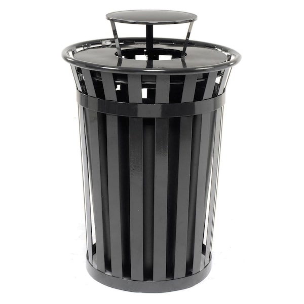 Steel trash cans feature a polyester powder coated finish on a rugged, long lasting flat bar steel body that deters graffiti and vandalism. Metal band top for extra strength. Steel garbage cans endure extreme climate conditions making them great for outdoor use. Rain Cap Lid prevents rain or snow from entering container. Includes anchor kit and black plastic liner.