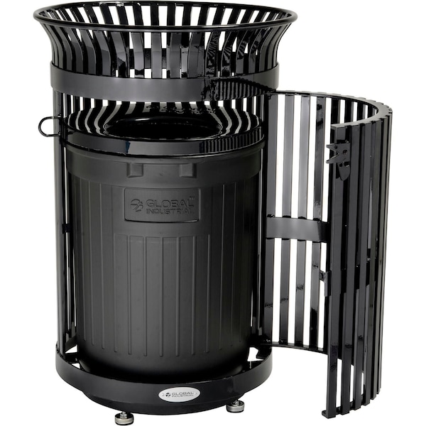 Strong slatted steel body with pre-attached lid to withstand outdoor conditions. Ergonomic access door reduces heavy lifting. Weather-resistant, fully assembled, and ships in one crate. Outfit your outdoors with the Global Industrial Outdoor Heavy-Duty Slatted Steel Trash Can, which offers high-level durability for harsh weather seasons. This 36-gallon Global Industrial Outdoor Heavy-Duty Steel Slatted Trash Can at 42inH with Flat Lid and Access Door is perfect for parks, outdoor venues, campus grounds, and industrial grounds. The large slatted steel trash can gives you a large capacity for rubbish with design and construction details that provide resistance to the elements, graffiti, and vandalism. The flat-bar steel slats are fully-welded and treated with a polyester powder coat finish to create a durable receptacle that will hold up against harsh summer and winter weather. Includes anchor kit, security cable, and plastic liner.