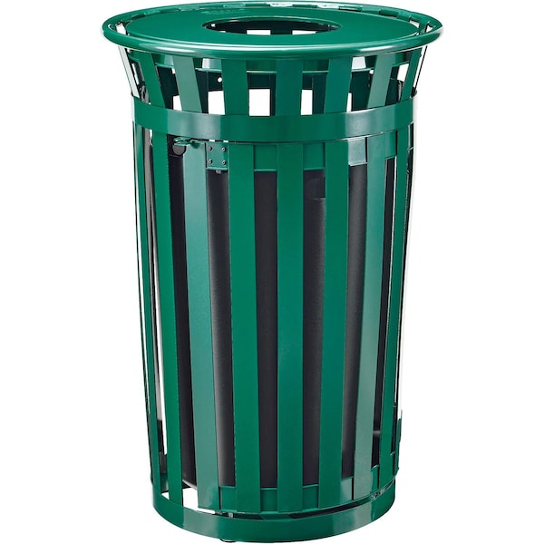 Outdoor Metal Slatted Waste Receptacle w/Access Door & Flat Lid - 36 Gallon Green. Fully welded durable receptacle has a rugged galvanized steel body that is reinforced with circular bands and rolled edges. Endures extreme climate conditions. Flat bar steel deters graffiti and vandalism. Electro-coating plus powder coating two stage protection process. resists rust and increases durability. Access door with slide out liner helps reduce heavy lifting and ease servicing, even in tight areas. Access door is padlockable to prevent unsolicited opening lock sold separately. Doors feature heavy duty hinges for smooth and easy opening. Rubber bumpers for quiet door closing. 36 gallon capacity. Includes anchor kit, leveling feet and black plastic liner.