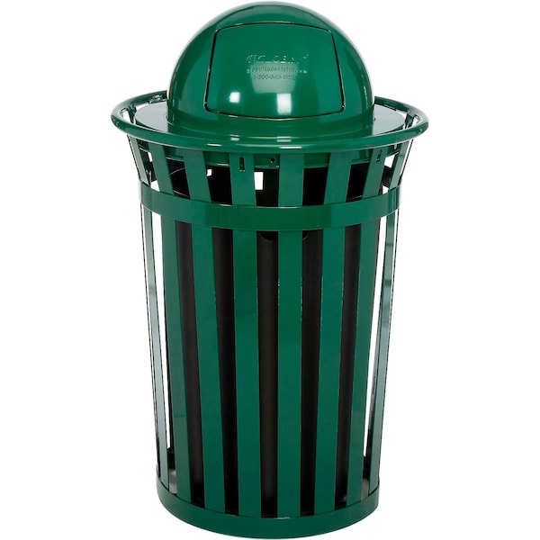 Fully welded durable receptacle has a rugged expanded galvanized steel body that is reinforced with circular bands and rolled edges. Dome lid helps keep waste out of sight and keeps rain or snow out of trash receptacle. Self-closing swing-action push door allows easy waste disposal. 36 gallon capacity. Includes anchor kit and black plastic liner. Endures extreme climate conditions. Flat bar steel and polyester powder coated finish deters graffiti and vandalism.