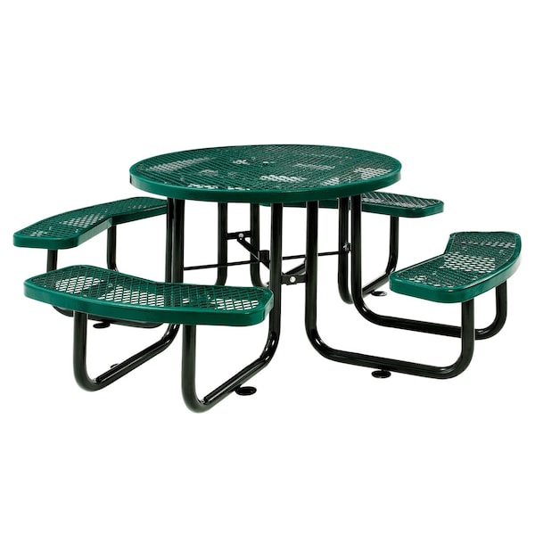 46in Round Expanded Metal Picnic Table Green - 277150GN. Portable Metal Mesh Picnic Tables are ideal for high-traffic seating areas in parks, campuses, snack bars and more. Picnic Tables are made using heavy-gauge metal mesh with a green thermoplastic coating on benches and tabletop. This protective coating creates a smooth, high-gloss surface that stays cool to the touch for comfortable seating even in the sun. Thermoplastic coating resists fading, mold and vandalism, and will ensure maintenance-free durability through years of high-traffic usage. Rugged galvanized tubular steel frame is shielded with a black powder coat finish for rust-prevention and resilience against the elements. Bench and table corners are beveled for safety. Mounting tabs allow anchoring to ground for stability and security. Table top is 29-1/2inH. Benches measure 12inD x 16-1/2inH. Tabletop features an opening to accept an umbrella with a pole of up to 1-1/2in diameter. Set screw included to hold umbrella pole in place. Umbrella base not required.7 Year Limited Warranty.