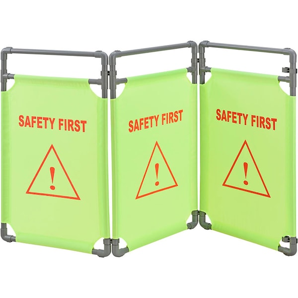 The alert green/yellow fabric with an enlarged Safety First message makes this barricade highly visible, even in low lighting conditions. Lightweight at only 7 lbs., this sign is designed for portable transport and folds easily for storage. Unlike many standard signs that are rigid, this unit is also designed with adaptability in mind. The sign features three 22-1/2 L x 38 H panels and extends to 69L. Each section is 1 thick - folded thickness is 3-1/2. Constructed with gray tubular plastic and fabric material that is made of water and mildew-resistant polyester. Message displayed in English.