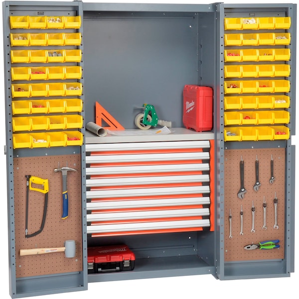 Our rugged steel storage cabinet features box-formed, reinforced 4in deep pocket doors that swing open 270° for full access. Doors hold louvers that support plastic bins and pegboards with 60 hooks for easy access to tools.Drawers have 400 lb. capacity, extend completely on ball bearing suspensions, and measure 36inW x 18inD with assorted heights : 83inH. High-pressure laminate work surface is 1-3/4in thick and lets you work within the cabinet. Cabinet measures 38inW x 24inD x 72inH overall. Grey powder coat finish. Ships assembled. The cabinets are not returnable.