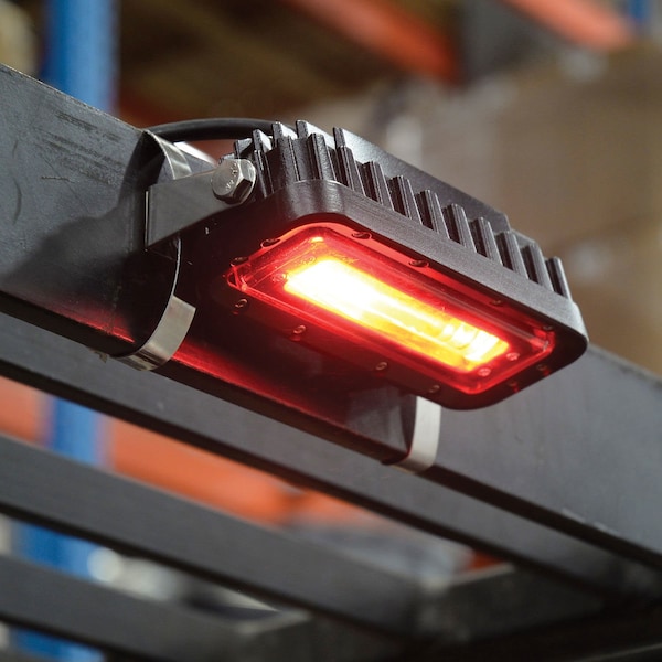 provides a visual warning for warehouse personnel by projecting a bright red beam pattern onto the floor, on either sides of the forklift, helping to promote greater workplace safety. This red beam is a visual indicator of the safe distance workers should keep between themselves and the forklift. By staying outside of this perimeter, workers will avoid foot injury and collision from rear-end forklift swing. Shock-resistant IP68 LED Light Emitting Diode lights and UV-resistant polycarbonate lens projects a visible red beam on the side of the forklift to alert workers of nearby forklift traffic. LED forklift safety light uses the vehicle electrical power to operate and can be installed on the side of any forklift, sweeper, AGV or industrial vehicle. The 30,000 hour minimum service life LED's are mounted in a rugged aluminum housing for long life.