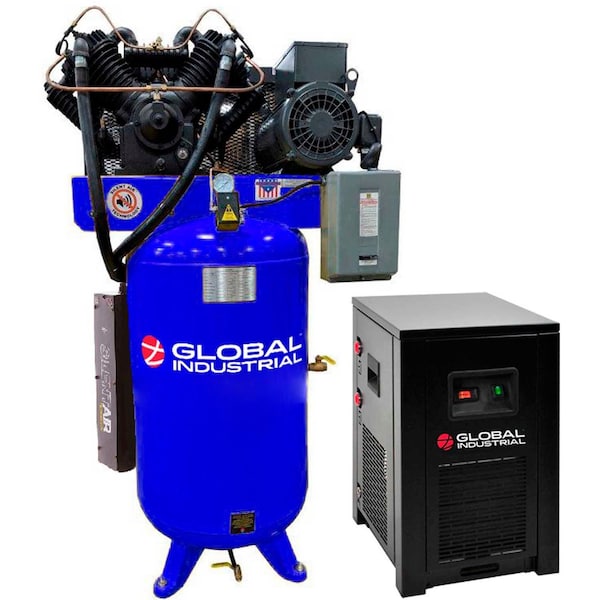 The Global Industrial Silent Two Stage Piston Air Compressor with Dryer offers superior performance and is designed to provide years of reliable service. Silencer reduces noise output by 25% binging the dBs to 55, which is comparable to conversational loudness. A 50,000-hour industrial use life span makes this compressor ideal for commercial and industrial manufacturers, auto repair shops, small to mid-sized businesses, and those who perform frequent DIY projects. Overall measurements: 27 L x 42 W x 71.5 H. Silencer is not pre-installed, and must be installed by the purchaser. The Global Industrial Refrigerated Air Dryer offers superior performance and is designed to provide years of reliable service. This dryer, requiring little to no maintenance, is efficient and ideal for use with compressors that do not have aftercoolersremoving oil, water, dust, and dirt particles to improve air quality, tool life, and project results. Its compact design can fit just about anywhere and can be used with 5HP 7.5HP, and 10HP compressors up to 57 CFM.Overall measurements: 22 L x 13 W x 23 H.