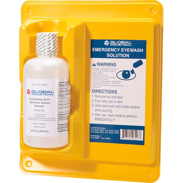 Portable bottle. Comes assembled. 98.3 % ophthalmic solution. All those in favor of workplace safety say fteye.ft The Global IndustrialTM Single Bottle Eyewash Station is a great back up for a quick response to eye accidents in large work environments, where employees might need immediate treatment. The smaller size of these stations is ideal for mounting in workspaces when irritation, burning, and itching occur from dust, smoke, or chemical contamination is possible. The removable bottles are also perfect for portable use when transporting an injured worker to a facility for further medical care. Place them within a 10 second walk from hazards to meet OSHA standards. 1 Year Limited Warranty.