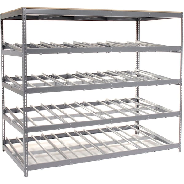 Single Depth Gravity Flow Carton Rack 4 LEVEL 96inW x 48inD x 84Hin - 184058. GRAVITY FLOW CARTON RACK Helps make inventory control more efficient. Unique inflowin design uses gravity to slide cartons to front for easy access. Loads from the back to ensure that first inventory in is the first inventory out. Cartons are transported on roller tracks constructed of U-shaped galvanized steel channels with plastic wheels that support 50 lbs./ft. Box guide rails can be adjusted horizontally and beams can be adjusted vertically to accommodate varying carton sizes. Storage shelf levels are adjustable on 1.5in centers for height flexibility. Box guide rails are used between each pair of roller tracks. Additional roller tracks can be added depending upon carton sizes. Each gravity flow storage level includes four pair of roller tracks with five box guide rails and one cross support. Racks include 5/8in thick particle board top storage level that supports up to 1000 lbs. Gray baked enamel finish. Easy assembly.