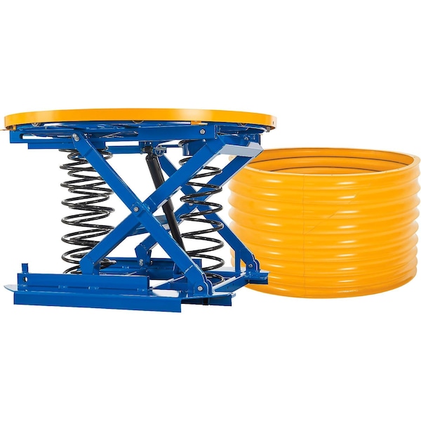 Helps to reduce worker strain and risk of injury from lifting, bending, and stretching . Full 360° rotational platform supports up to 4500 lbs . Included bellows package offers added finger and foot protection. This ergonomic tool is ideal for building or unpacking pallet loads. A combination of heavy-duty springs and shock-absorbing dampener help maintain a constant working height without overshoot or spring bounce, lowering and raising the carousel as packages are removed or added. No power or air supply is required, and it is virtually maintenance-free. The 43-5/8in diameter turntable features low-friction bearings for smooth operation. Full 360° access allows for nearside loading without reaching, as the operator can step closer to the unitfts platform to add or remove pallet loads. Wide, free-standing base features 36-5/8inL x 6inW x 2inH fork pockets for easy relocation by fork lift. Strong tubular steel frame with durable powder-coat finish for long life.