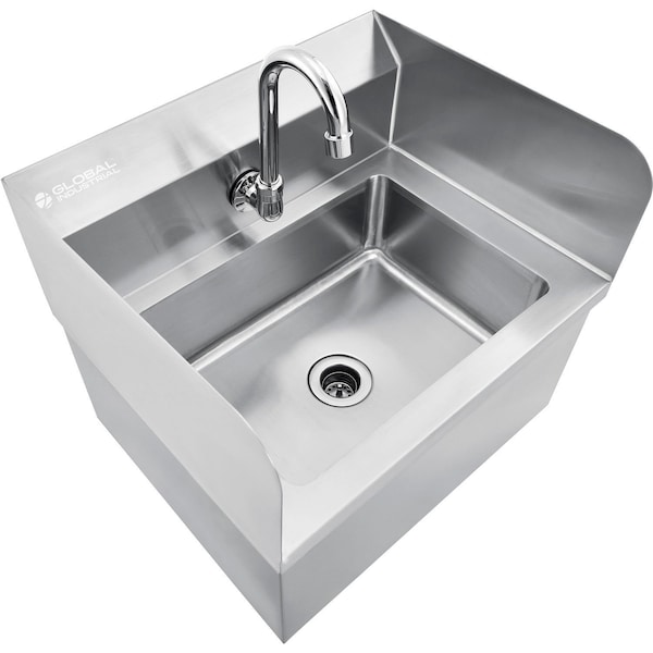 Uses knee valves to run hot or cold water, making it perfect for any commercial, educational, or industrial space where hands or tools need to be cleaned frequently. The deep basin allows elbow-deep scrubbing while keeping splashes within four walls of stainless steel. High backsplash design protects walls from water residue and damage. Constructed of 18 gauge, 304 stainless steel for maximum corrosion resistance. Includes knee activated water switch and gooseneck faucet. 14W x 10D x 5D basin bowl. Features back-splash, side splashes and basket type drain. 1/2 hot and cold supply. Wall mounting bracket and fasteners included. Easy assembly. NSF Listed. .