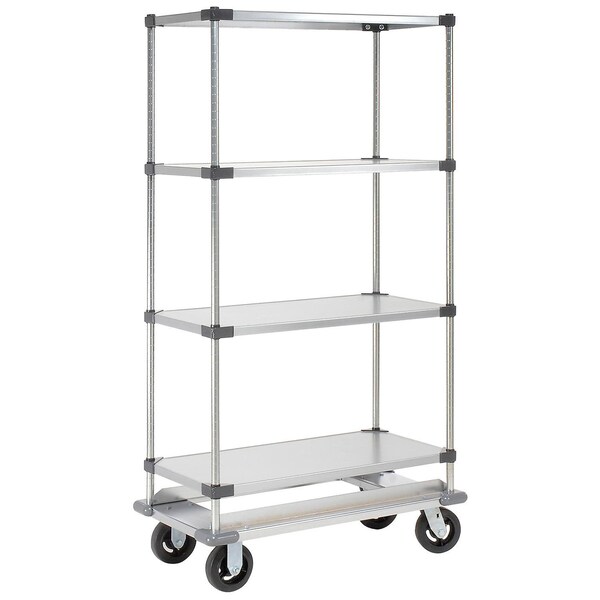 Fast, easy assembly. 18-gauge clear epoxy coated galvanized steel shelves are corrosion resistant, adjust on 1 increments and feature a raised shelf edge to keep items from falling during transport. Individual shelf capacity not to exceed 400 lbs. Dolly Base offers a strong, durable chrome-plated steel base for additional capacity and stability. Corner bumpers help protect walls.