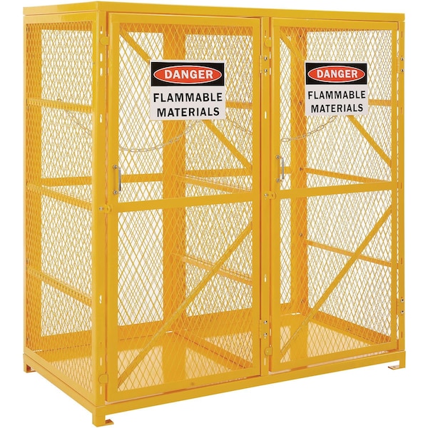 Solid 14 gauge steel top and bottom for strength. 1/8x1-3/16 expanded metal doors and sides which allow for ventilation and visibility of contents. Rust and acid resistant safety yellow powder coat finish for long lasting durability. Padlock hasp keeps contents secure for safety storing compressed air/gas cylinders and tanks. padlock not included. Magnetic catches keep doors safely shut when not locked. Accepts 20 lb and 33 lb LPG cylinders. Vertical cabinets accept all standard vertical cylinders. Includes chain to hold cylinders in place. DANGER FLAMMABLE MATERIALS sign is located on the doors. Pre-punched lagging holes in feet for anchoring to the ground. Comply with OSHA regulations. Ships fully assembled, ready to use.
