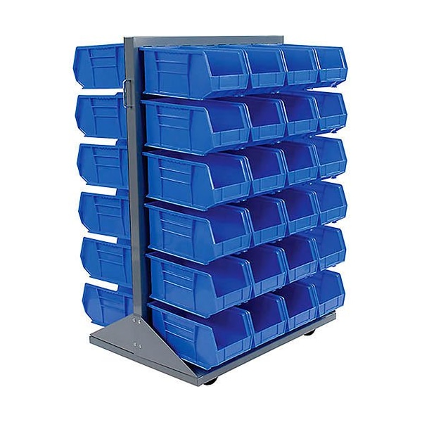 Organize, transport and store parts, components and hardware withmaximum efficiency. Heavy-duty 16-gauge steel louvered bin rack provides easy removable or polypropylene bins. Double Sided Carts with handle allows you to move parts and hardware to different work sites on 4 swivel 3in rubber wheel casters. 500-lb.capacity, gray enamel finish. Assembly is fast and easy.