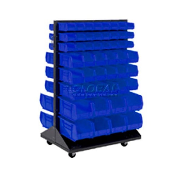Mobile Double Sided Pick Rack. Store and organize small parts with excellent visibility and access with this floor rack. Easily add or remove bins from the heavy-duty, 16-gauge enamel steel pick rack or stacking bins as needed to make the best use of space. Break-resistant polypropylene stacking bins; wonftt rust, chip or crack. They feature a generous label area, finger grips for easy handling, anti-slide stops and reinforced ribs. Moves on 4 swivel casters that measure 3in diameter. 500 lb. total unit capacity. Easy assembly.