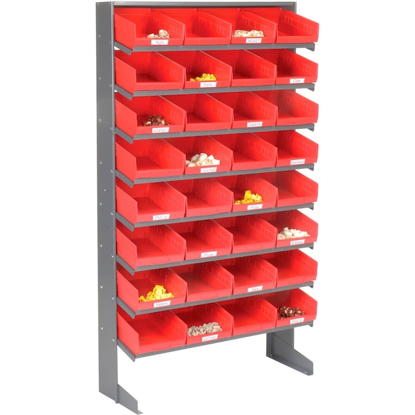 Inclined shelves permit excellent visibility and access to bin contents. Made of heavy-duty, 16-gauge steel, these racks have a gray enamel finish and are available 3 styles: Bench, Floor or Mobile Double Sided styles. Quality polypropylene AkroBins® wonftt rust, chip or crack and feature a generous label area, grips for easy handling, anti-slide stops and reinforced ribs. Unit capacity 500 lbs. 6-1/2in space between each shelving. 6-1/2in space between each shelving. Shelves assemble easily. Comes with four additional bins. 36 bins total.