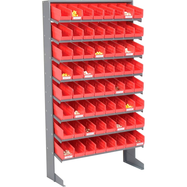 Inclined shelves permit excellent visibility and access to bin contents. Made of heavy-duty, 16-gauge steel, these racks have a gray enamel finish and are available 3 styles: Bench, Floor or Mobile Double Sided styles. Quality polypropylene AkroBins® wonftt rust, chip or crack and feature a generous label area, grips for easy handling, anti-slide stops and reinforced ribs. Unit capacity 500 lbs. 6-1/2in space between each shelving. Shelves assemble easily. Comes with 8 additional bins. 72 bins total.