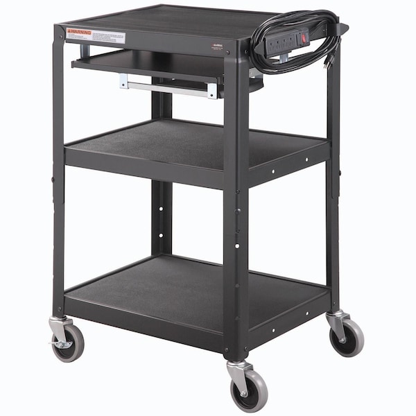 This Mobile Laptop & Computer AV cart is great for transporting and carrying valuable Audio Visual equipment and computer equipment. Compact 24L x 18W steel mobile workstation offers a retractable 19-1/2W x 16D sliding shelf and a pull-out mouse pad that extends to 11. Includes a UL and cUL listed 4-outlet power strip with a 15' 3-wire cord. Shelves adjust from 24 to 42H on 4 increments and have a 1/2 lip to retain load. Steers easily on 4 swivel casters two with locking brakes. Durable powder coat finish. Assembles easily.