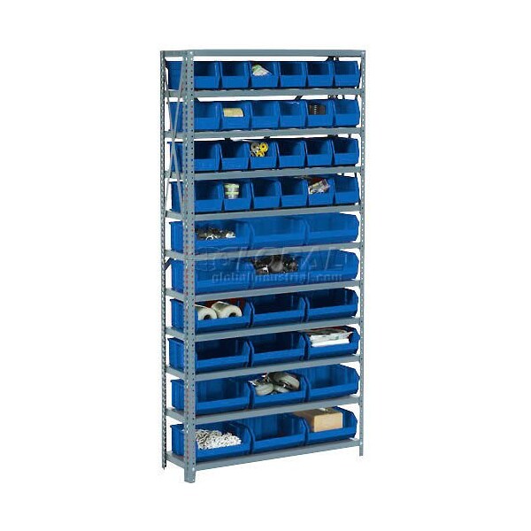 Steel Open Shelving with 21 Blue Plastic Stacking Bins 8 Shelves - 36in x18in x 73in. Keeps parts organized with these high capacity shelf bin units, perfect for production and assembly. Includes tough polypropylene plastic bins featuring finger grips for easy handling, anti-slide stops and reinforced ribs to prevent spreading when full. Large label slots help provide quick inventory identification. Gray enamel finish. Only one bin color per shelving. Assembles easily. OPEN style shelving has anti-sway braces on the back and the sides for added stability. Easy to assemble rugged steel shelving with long-lasting gray baked enamel finish.