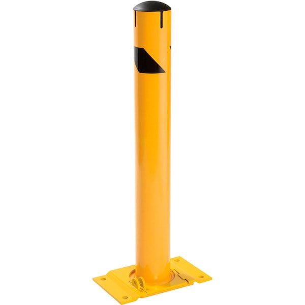 Removable plastic cap allows concrete to be filled inside for extra reinforcement. Chain slots help connect to similar bollards to help form a more established barrier. Floor mountable and includes removable base. Provide equipment protection and designate where industrial vehicles cannot enter with the Global Industrial™ Steel Bollard with Chain Slots & Removable Cap. This bollard is ideal for protecting doorways, corners, and industrial equipment. All welded steel construction. Safety yellow powder coat finish provides strong visibility. Height: 36in. Base Thickness: 3/8in. Resilient 12 Gauge Steel. Moderate weight allows easy floor mounting.