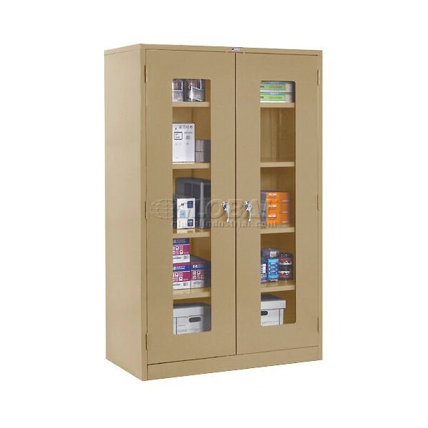 GlobalTM Clear View Storage Cabinet Assembled 36x18x78 - Tan. The best value on the market, these storage cabinets feature rugged door construction where it matters most Doors have 3 extra large 4in x 3/8in barrel hinges each for security, channel reinforced impact resistant acrylic windows, 3-point locking system with pry-resistant solid steel 5/16in latching rods, and dual chrome plated die-cast key locking handles. Box-formed shelves have full width steel channel reinforcement to help prevent shelf deflection. Holds 300 lbs. per shelf and meets ANSI/ BIFMA shelf capacity standards. Assembled Clear View Cabinets are not returnable.
