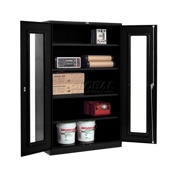 GlobalTM Clear View Storage Cabinet Assembled 48x24x78 - Black. The best value on the market, these storage cabinets feature rugged door construction where it matters most Doors have 3 extra large 4in x 3/8in barrel hinges each for security, channel reinforced impact resistant acrylic windows window dimensions 9.25inx61in, 3-point locking system with pry-resistant solid steel 5/16in latching rods, and dual chrome plated die-cast key locking handles. Box-formed shelves have full width steel channel reinforcements to help prevent shelf deflection. Holds 300 lbs. per shelf and meets ANSI/ BIFMA shelf capacity standards. Includes center I-beam installed in the base of the cabinet. Shelf dimensions 47.8125inL x 22.125inD. Assembled Clear View Cabinets are not returnable.