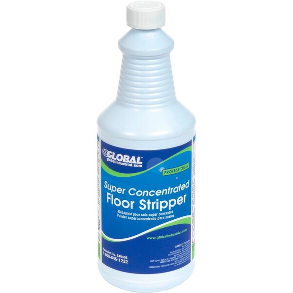 Global Industrial Super Concentrated Floor Stripper - Case Of Six 1 Quart Bottles. Super concentrated stripping solution that offers maximum speed and effectiveness when stripping floors. Removes all types of water-based finishes and sealers from resilient tile, terrazzo, brick, quarry tile, and stone flooring. Quickly cuts through, loosens and emulsifies heavy buildups - even those that have been repeatedly high speed buffed and propane burnished. Ammonia free. Clear color. 32 oz. bottle. Sold 6 bottles per case. Intended for Industrial/Commercial use.