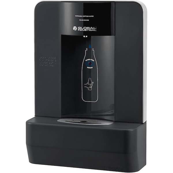 Keep patrons and staff hydrated with this Global Industrial Surface Mount Water Bottle Filling Station. Featuring a heavy-duty steel construction, a drainage system that eliminates standing water, and a laminar water flow to minimize splashing, this indoor bottle filler is an ideal solution for warehouses, airports, hotels, schools, offices, and more. It has an LED display counter that tracks the number of bottles saved from landfills and an LED filter level indicator that informs you of when it's time to change the filter. Includes a 3,600-gallon capacity PFAS and microplastic water filter to meet all your filtration requirements - total PFAS filtration (PFOA+PFOS, PFNA, PFHxS and PFHpA reduction) along with NSF/ANSI 42, 53, 372, and 401 compliance. Its built-in sensor dispenses water into bottles at a quick-fill rate of 1.0 GPM, providing a completely touch-free experience. This item meets ADA guidelines. Patented & Patents Pending