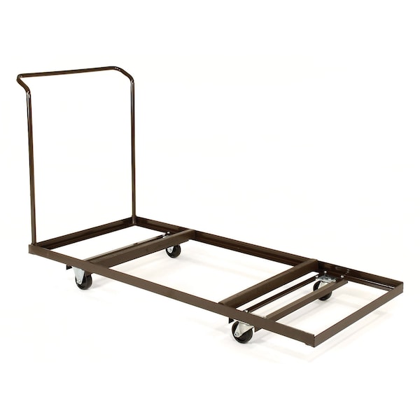 Mobile cart organizes and stores rectangular folding tables in a flat stacked position. Non marring 4 heavy duty casters two fixed, two swivel. 2 welded angle steel construction. Easy assembly.