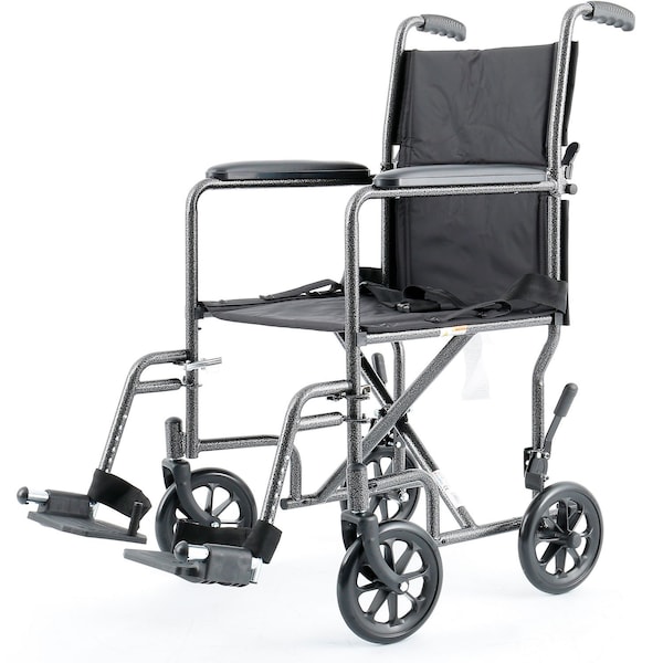 Hand brakes, wheel brakes, and seat belt/leg strap for added safety. Foldable for easy storage. 250 lb weight capacity. The Global Industrial™ Transport Chair is designed to help healthcare staff, caretakers, and custodians provide simple and safe short-distance transportation for patients and guests. This Transport Chair includes plenty of safety features, making it suitable for hospitals, clinics, and senior care facilities for intaking, assessment, and discharging. Perfect for those with rollators or walking devices at home and is also built to help provide mobility transportation to and from areas for day-trip vacations, short outings, and essential trips. Safety features include a seatbelt and leg straps for fall prevention and locking brakes to keep the chair in a stationary position. Wheelchair seat features a resilient, low maintenance nylon upholstery thatfts easy to clean. Rolls on dependable solid rubber tires mounted on composite wheels to ensure smooth transportation. Powder-coated aluminum frame for lasting use. Transport chair is designed to be rolled by an aide or helper and not the user. Padded armrests for added comfort. Seat to Floor Height: 19-1/2in. Back Height: 18in. 8in front solid rubber wheels