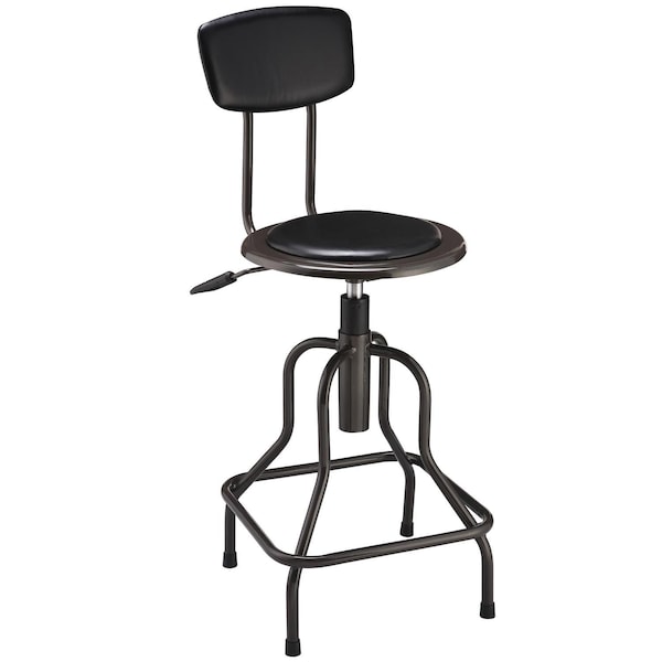 Industrial stool is ideal for educational, industrial and institutional market applications; including schools, shops, warehouses and design studios. Made using all-welded heavy gauge steel with a charcoal powder coat finish. Tubular steel base features a fixed height, square foot ring. Includes non-marring floor caps. Back measures 12-1/2W x 7H. Easy assembly. Black vinyl upholstered seat and back. 22-1/2 to 25-1/2 pneumatic seat height adjustment with tilt lock. Seat measures 14 diameter.