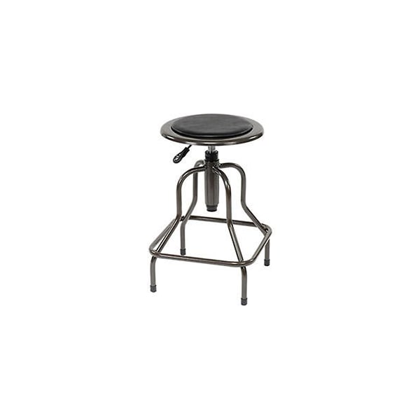 Industrial stools are ideal for educational, industrial and institutional market applications; including schools, shops, warehouses and design studios. Made using all-welded heavy gauge steel with a charcoal powder coat finish. Black vinyl upholstered seat. 22-1/2 to 25-1/2 pneumatic seat height adjustment with tilt lock.Tubular steel base features a fixed height, square foot ring. Includes non-marring floor caps. Easy assembly.Seat measures 14 diameter.