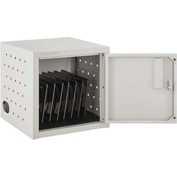 Easily charges, stores, and transports up to 8 devices. Cabinet is lockable to prevent theft and includes two keys. Includes ventilated sides to allow constant airflow and avoid overheating. Say goodbye to cord clutter with the Global Industrial™ Wall/Desk Tablet Charging Cabinet. This cabinet allows business owners, hospital staff, schools, and libraries to safely charge and store their devices in an organized fashion. The steel shell with lockable door, padded interior, and rubber-coated dividers protect devices, while its compact size makes it easy for wall-mounting or desktop use. It arrives assembled and includes the drywall mounting hardware. UL-Listed 12-outlet 120V/15A horizontal electrical power strip. Meets ANSI/BIFMA standards. Weight capacity: 30 lbs. when evenly distributed. Divider Slots: 1in W x 12in D with 13.25in H of top clearance. Cord Length: 10 feet