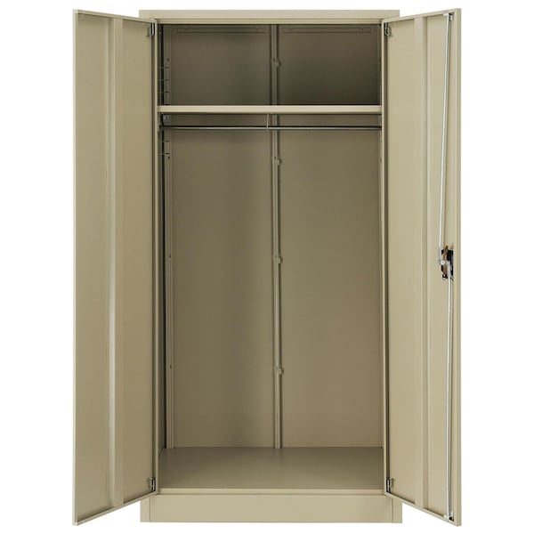 Durable cold rolled steel using 24 gauge steel body reinforced with a 22 gauge steel frame. The channel reinforced, box formed doors include 3-point locking mechanism with a super strong 5/16 round locking bar and nylon guides for silent operation and consistent alignment. The cabinets feature one full width fixed shelf and one full width garment rod. Top Shelf allows storage of personal items. Recessed locking handle with 2 keys for safety and security. Durable Tan powder coat finish.