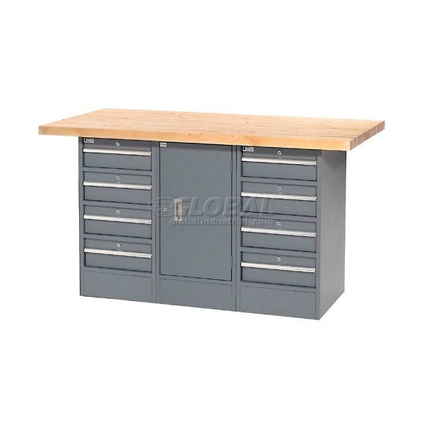 Workbench w/ Maple Square Edge Top, 8 Drawers & 1 Cabinet, 60inW x 30inD, Gray