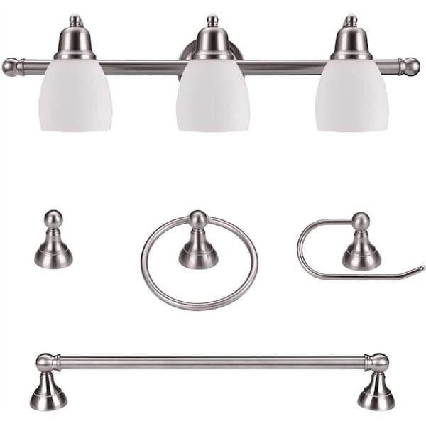 Globe Electric's 5-Piece Jayden All-In-One Bath Set is a wonderful way to update your bathroom with one easy step. Complete with a 3-light vanity fixture, towel bar, towel ring, robe hook and toilet paper holder in satin nickel, your bathroom will look streamline and welcoming. Add a compatible dimmer switch to your vanity fixture to create a warm ambiance for a relaxing bath. While the pieces complement each other you can split this set up and use it throughout your home. The towel bar makes an excellent shoe holder. The towel ring would be great in your kitchen. The vanity light would work in your bedroom. Think outside the box. Requires three medium based 60-Watt bulbs sold separately.All in one: update your bathroom easily with a matching 3-light vanity fixture, towel bar, toilet paper holder, towel ring and robe hook with a satin nickel finishClassic design: with a clean, simple, classic design this set will go with any decorEasy install: includes all mounting hardware for quick and easy installationVersatile: use the pieces individually in bathrooms, kitchen or bedroomBulb requirements: 3x E26/medium base 60-Watt bulbs sold separatelyGlobe Electric works tirelessly to design and manufacture products that deliver beautiful appeal, stellar performance, easy installation and exceptional valueGlobe Electric - the creative energy company