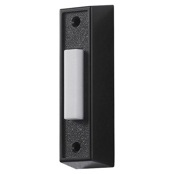 Black with white wired push button is classic by day or night. The unlighted, white bar contrasts easily against the black plastic frame. This push button is mounted to the surface of your doorframe or exterior wall.
