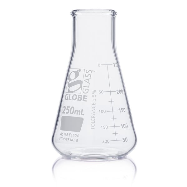 Flask, Erlenmeyer, Globe Glass, 250mL, Wide Mouth, Dual Graduations, ASTM E1404, 12/Box
