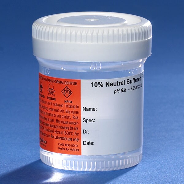 Pre-Filled Container with Click Close Lid: Tite-Rite, 60mL (2oz), PP, Filled with 30mL of 10% Neutral Buffered Formalin, Attached Hazard Label, 24/Box, 4 Boxes/Unit