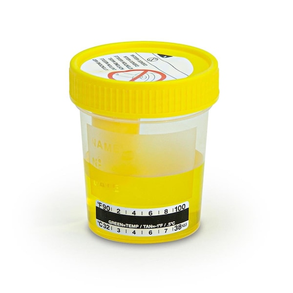 TransferTop Urine Collection Cup with Integrated Transfer Device, 4oz (120mL), Graduated to 100mL, STERILE, Bulk, Affixed Temperature Strip, 300PK
