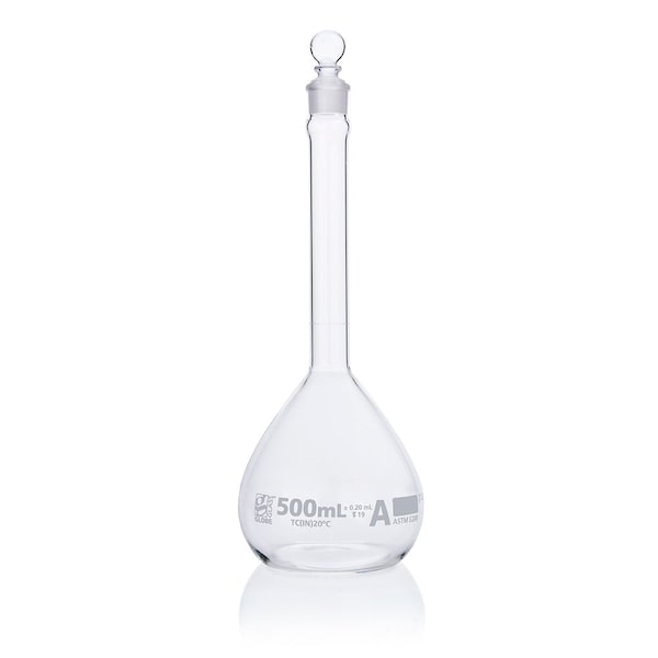 Volumetric Flask, Capacity - Metric 500 mL, Capacity - English 16.91 fl oz, Flask Type Volumetric, Overall Height - Metric 260 mm, USP Specification Type I, Tolerance 0.20 mL, Includes Closure Yes, Closure Type Stopper, Neck Style Straight, Closure Material Glass, Compatible with Stopper Size 19, Sterile/Non-Sterile Non-Sterile, Autoclavable Yes, Body Color Clear, Graduated Yes, Graduation Increments - Metric Not Applicable, Mouth Size Wide, Glassware Class A, ASTM Specification E237, E288, E438