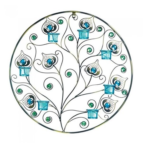 This gorgeous attention-getting candle sconce is nearly 2 feet in diameter! Holds seven tealight candles in light blue glass candle cups over a background of a peacock-inspired pattern. The circular metal frame features green and blue faceted gems to add shimmer and shine. Weight 3.4 pounds. 23 inches in diameter x 3 inches. Metal and glass.