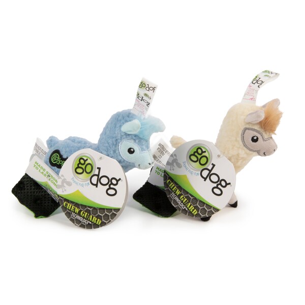 goDog Llama with Chew Guard TechnologyTM in soft textured cuddly fleece, Mini size is perfect for the smaller breeds. Available in a 2 pack of light blue and ivory. goDog plush dog toys are designed to be stronger and last longer, no matter how your dog plays. These soft plush toys are made more durable with Chew Guard TechnologyTM which is a special manufacturing process that adds a super tough and durable lining to soft plush toys. goDog toys and travel products are produced from a foundation of innovation, durability and most importantly FUN! Our silly, colorful plush dog toys feature Chew Guard Technology enabling them to last longer than standard plush toys and are backed by our Chew Guard GuaranteeTM. Our Rope TekTM fetch and chase toys utilize our patent -pending manufacturing process Therma-Fuse TechnologyTM bonding climbing rope with non-toxic polymer. We continue to strive for innovation and fun and are expanding into unique product lines with new durable ways to play and enjoy life. Trustworthy and family friendly, goDog toys and travel products are designed to child safety standards and we utilize environmentally friendly, sustainable and organic materials wherever we can, backed by our 100% satisfaction guarantee pet parents can rest easy with goDog products!