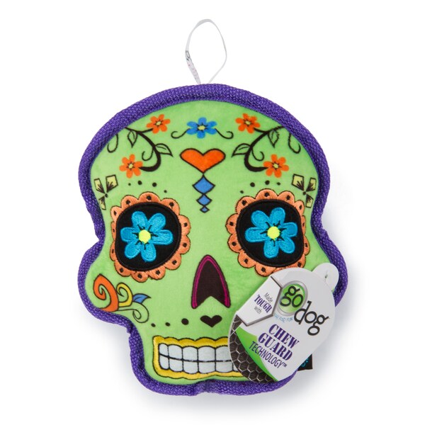 Día de los Meurtos Fun! goDog plush line's new trendy addition Sugar Skullz is sure to inspire festivity along with pup play time. Bright color and shapes with limited stuffing. We have used a puncture proof squeaker and Chew Guard Technology to stand up to tough play! Available in small and large, blue or green. goDog toys and travel products are produced from a foundation of innovation, durability and most importantly FUN! Our silly, colorful plush dog toys feature Chew Guard Technology enabling them to last longer than standard plush toys and are backed by our Chew Guard Guarantee . Our Rope Tek fetch and chase toys utilize our patent -pending manufacturing process Therma-Fuse Technology bonding climbing rope with non-toxic polymer. We continue to strive for innovation and fun and are expanding into unique product lines with new durable ways to play and enjoy life. Trustworthy and family friendly, goDog toys and travel products are designed to child safety standards and we utilize environmentally friendly, sustainable materials wherever we can, backed by our 100% satisfaction guarantee pet parents can rest easy with goDog products! Read all packaging instructions, warnings and cautions upon receipt. Packaging contains small parts, discard after opening.
