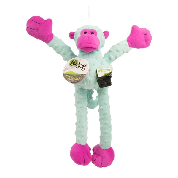 goDog Crazy Tugs Monkeys feature fun arms and legs that pull through the body for a great tug of war game with you and your dog. Made with Chew Guard Technology these toys will stand up to tough play. Squeakers and soft bubble plush are sure to please your dog. Available in small and large. goDog toys and travel products are produced from a foundation of innovation, durability and most importantly FUN! Our silly, colorful plush dog toys feature Chew Guard Technology enabling them to last longer than standard plush toys and are backed by our Chew Guard Guarantee . Our Rope Tek fetch and chase toys utilize our patent -pending manufacturing process Therma-Fuse Technology bonding climbing rope with non-toxic polymer. We continue to strive for innovation and fun and are expanding into unique product lines with new durable ways to play and enjoy life. Trustworthy and family friendly, goDog toys and travel products are designed to child safety standards and we utilize environmentally friendly, sustainable materials wherever we can, backed by our 100% satisfaction guarantee pet parents can rest easy with goDog products! Read all packaging instructions, warnings and cautions upon receipt. Packaging contains small parts, discard after opening.
