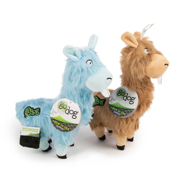 goDog Buck Tooth Llama with Chew Guard TechnologyTM in extra long soft faux fur, large size is perfect for the medium and large breeds. Available in a 2 pack of light blue and tan. goDog plush dog toys are designed to be stronger and last longer, no matter how your dog plays. These soft plush toys are made more durable with Chew Guard TechnologyTM which is a special manufacturing process that adds a super tough and durable lining to soft plush toys. goDog toys and travel products are produced from a foundation of innovation, durability and most importantly FUN! Our silly, colorful plush dog toys feature Chew Guard Technology enabling them to last longer than standard plush toys and are backed by our Chew Guard GuaranteeTM. Our Rope TekTM fetch and chase toys utilize our patent -pending manufacturing process Therma-Fuse TechnologyTM bonding climbing rope with non-toxic polymer. We continue to strive for innovation and fun and are expanding into unique product lines with new durable ways to play and enjoy life. Trustworthy and family friendly, goDog toys and travel products are designed to child safety standards and we utilize environmentally friendly, sustainable and organic materials wherever we can, backed by our 100% satisfaction guarantee pet parents can rest easy with goDog products!