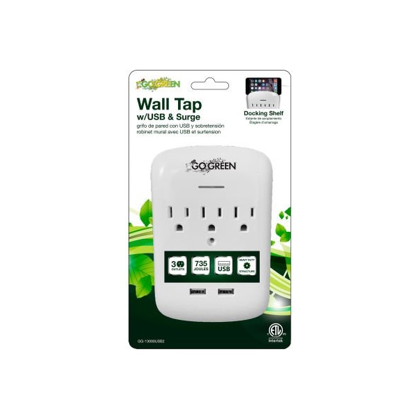 Gogreen power 3 outlet wall tap with 2 usb ports, 735 joules, gg-13000usb2-pkg - white the gogreen power 3 outlet wall tap with 2 usb ports is the ideal item for your home/office protection. Providing safety protection of up to 735 joules, simply plug wall tap into any 3 prong outlet to convert 1 outlet into 3 outlets. The surge surpressor is ideal for protecting personal computers, phones, faxes, printers and other electronics. It's 2.4 amp usb ports are perfect for keeping tablets, smart phones, and other rechargeable electronics ready to use. Unit has a 15 amp rating providing maximum power.