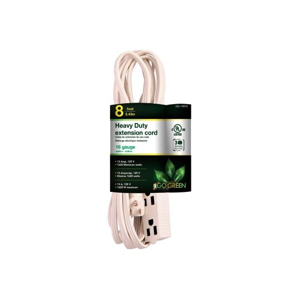 Gogreen power, gg-19608, 3 outlet 8 ft extension cord - right angle plug the power by gogreen 8' 16/3 3 outlet extension cord is slim and reduces clutter. Quickly turns 1 outlet into 3 and is ideal for small home appliances and general household electronics